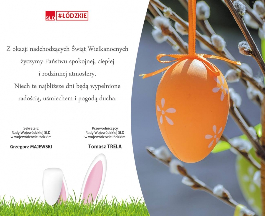 Z okazji zbliżających się Świąt Wielkanocnych, wszystkim mieszkańcom województwa łódzkiego, w imieniu Sojuszu Lewicy Demokratycznej w województwie łódzkim, życzenia złożyli przewodniczący SLD w województwie łódzkim Tomasz Trela i sekretarz wojewódzki SLD w województwie łódzkim Grzegorz Majewski.